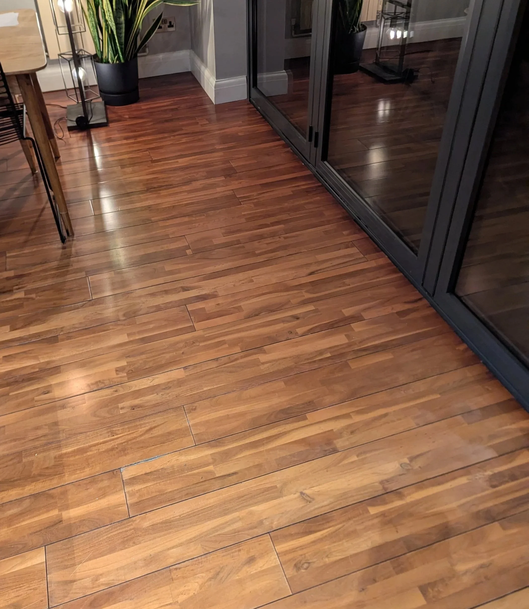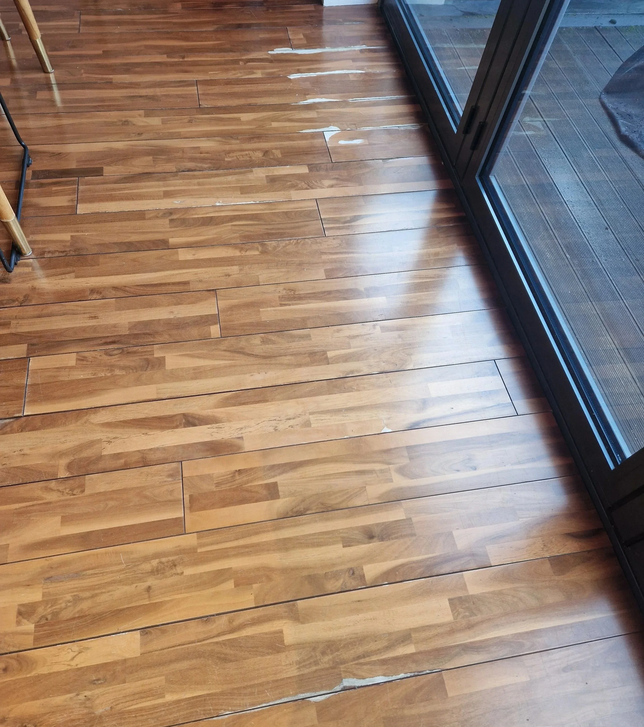 This engineered hardwood floor was damaged by water and wear leading to unsightly marks in an otherwise beautiful floor.